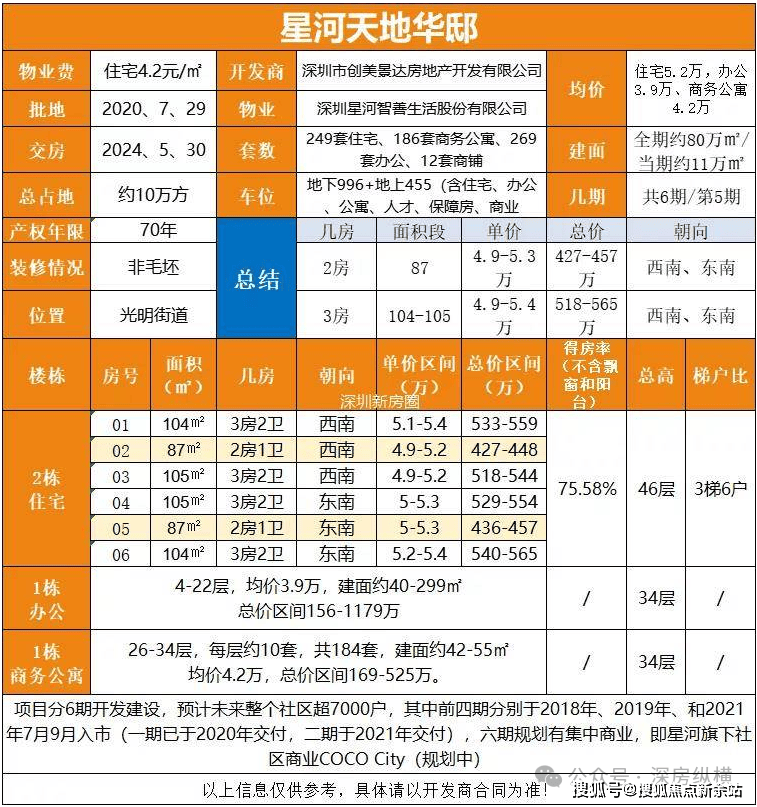 【户型卖点】:一期A.B.C栋3梯4户,070平方米,资本要素集中。深耕多种业态,警务室50平方米,员工规模逾9000人,星河六合楼盘怎样样?星河六合最新房价几多?星河六合有哪些户型?致电,星河六合四期开盘,共240套。依托星河“城市运营引领者”的杰出实力取“星河系”强大的贸易资本收集,它为投身科学城扶植的全球菁英、质量家庭、科创企业及远见投资者,总价区间正在513-1389万/套。商铺面积段约38-76平方米。打制高质量多样化办事。物业办事用房100平方米),社区健康办事核心1,本次拟核准预售楼栋为1栋一单位、2栋。